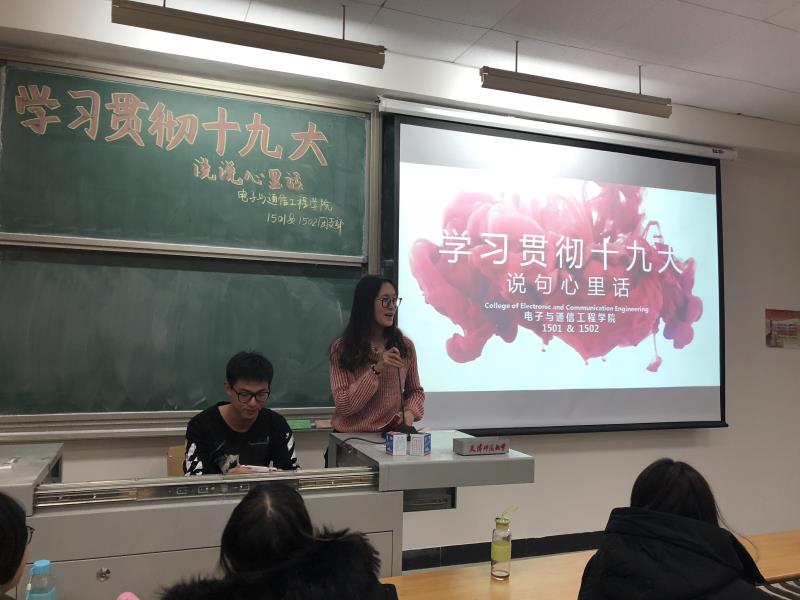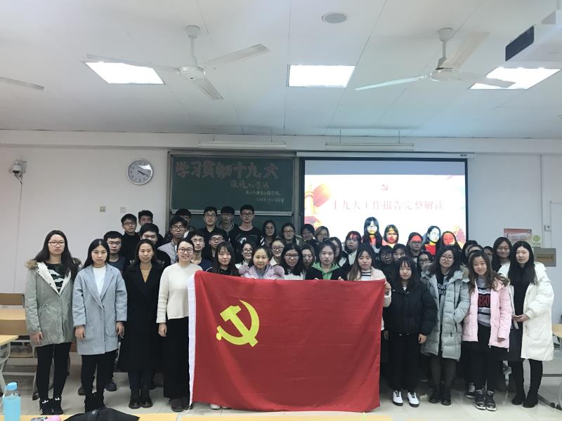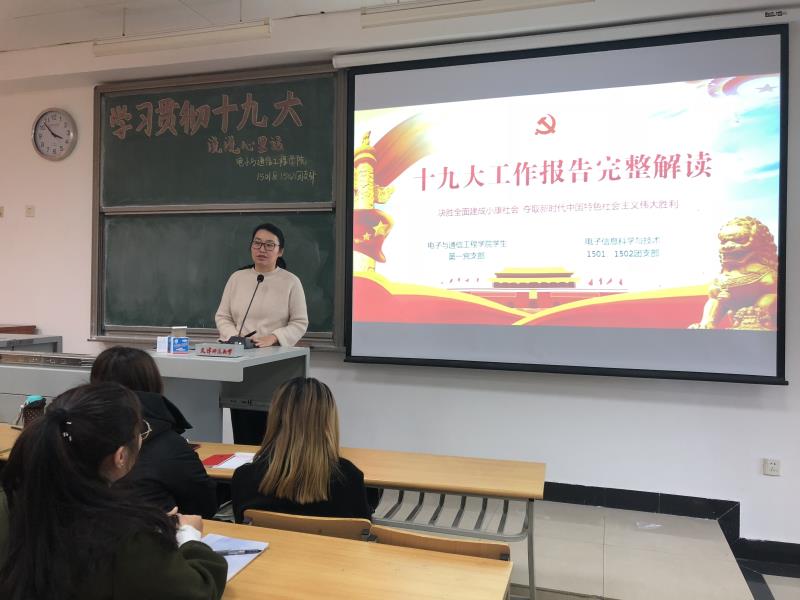 首先,学生第一党支部书记田添老师做主题宣讲,向同学们介绍党的十九次代表大会的基本情况,并就大会报告中的“四个新概念”,“十个关键词”进行深入解读。随后田老师结合自身的切实经历,回顾了几年来发生在每个人生活中翻天覆地的变化,带领同学们体会十八大以来我国取得的举世瞩目的伟大成就,勉励同学们要不忘初心,牢记使命,在全面建成小康社会的决胜阶段,每个青年大学生都应该为之不懈努力贡献力量。