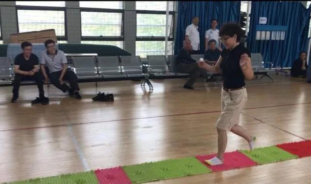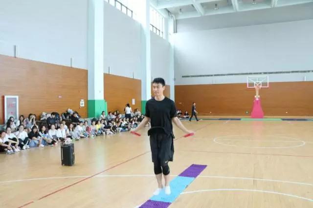 这难道就是传说中的指压板跳绳?只见赵晓楠老师稳稳的站在指压板上,颇有一夫当关万夫莫开之势,潇洒的身姿和敏捷的动作引来全场的欢呼。